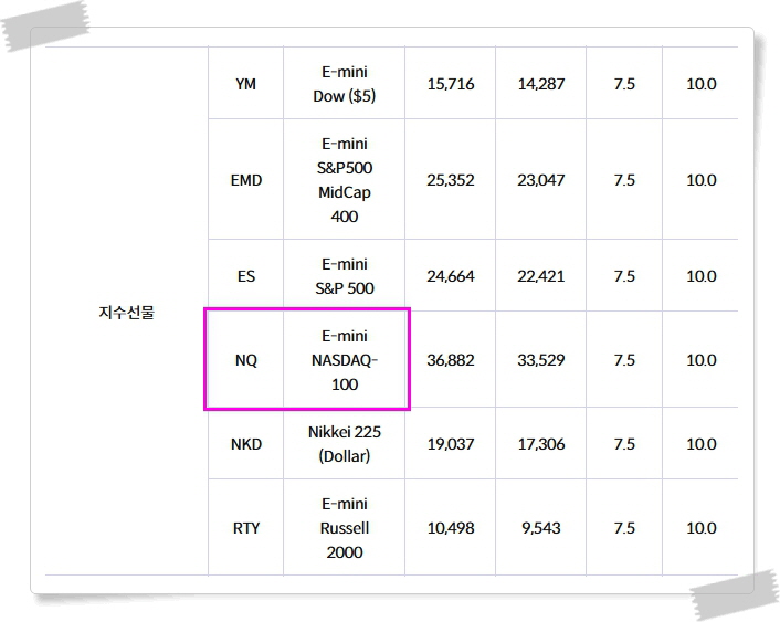 실제로 키움증권에서 ‘나스닥 100 미니’ 1계약을 운용하려면 약 $36,882라는 거액의 증거금이 필요합니다.