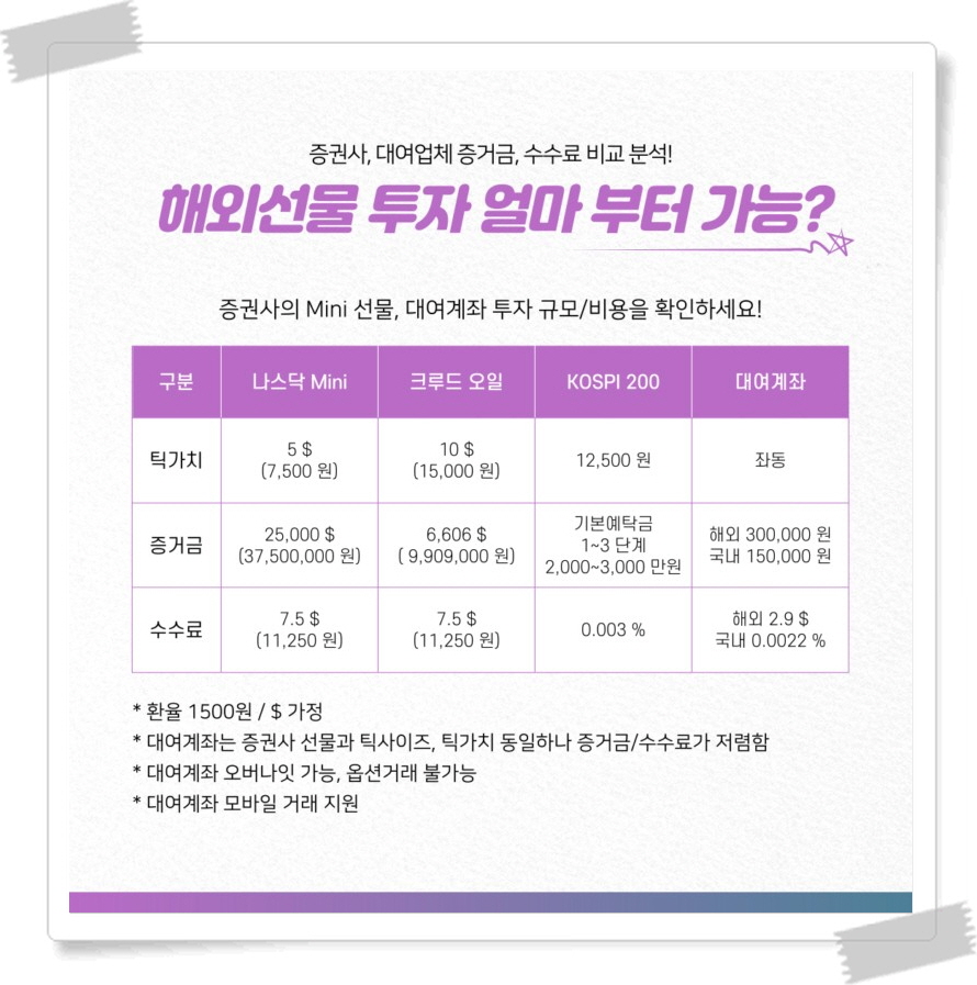 나스닥 미니 거래시 해외선물 대여계좌 에서는 최소 증거금 30만원, 수수료 2.9$로 매우 경제적입니다.