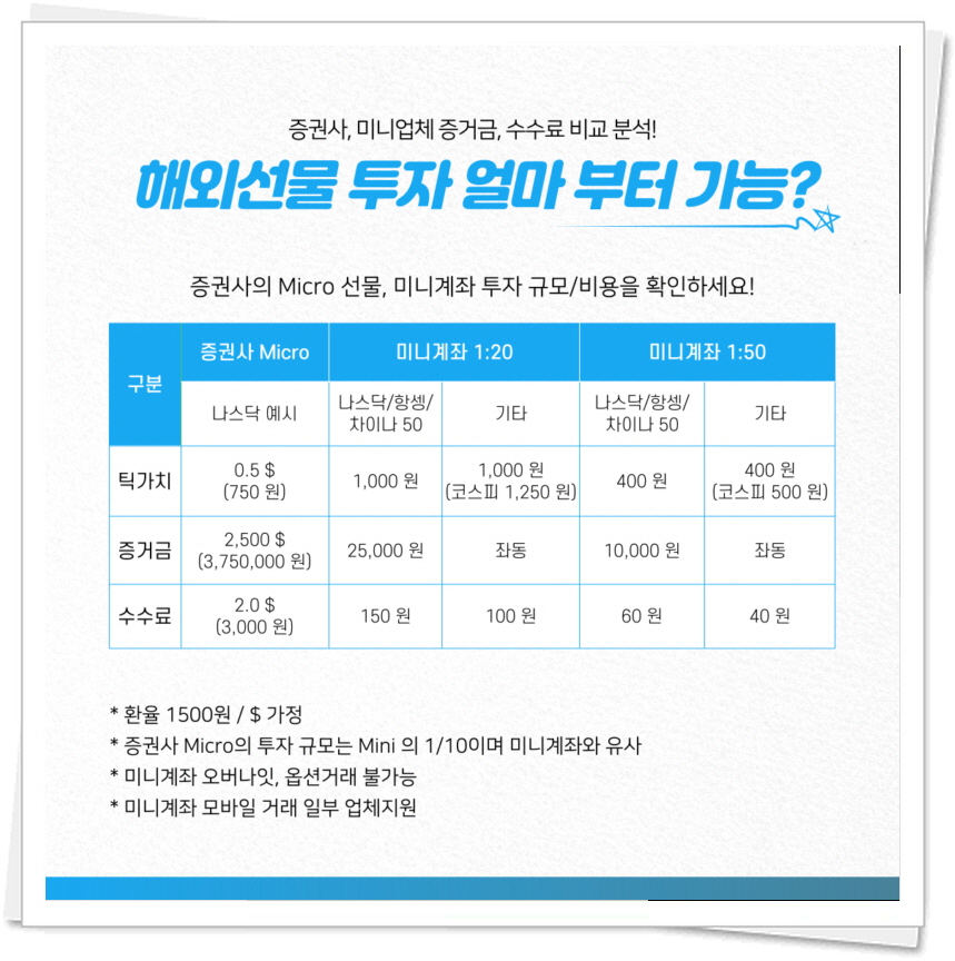 해외선물 미니업체 에서는 최소 1만 원의 증거금과 낮은 수수료(60원)로 일반 증권사 대비 소액 투자가 가능하도록 지원합니다.