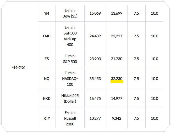 가장 대중적인 종목인 나스닥 100 지수를 기준으로 비용을 살펴보면, E-mini 나스닥 100 기준 한 계약당 약 $32,230의 증거금이 필요합니다.